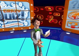 Up to 4 players are competing in a quiz game set in a virtual TV studio. They can select one of the wacky characters and use the Wii remote to answer questions and play mini games against each other.